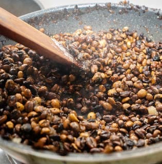 “Stir up,” he says to me and a visitor from New York City before leaving us to spin the beans in a circle, always in the same direction. We add butter until it melts into a blackish sauce, then it gets absorbed into the beans, turning them sticky like molasses. After the coffee is roasted, we set it aside for a while, then smash it to smithereens with a hammer and grind it into the powder that will be brewed into coffee.